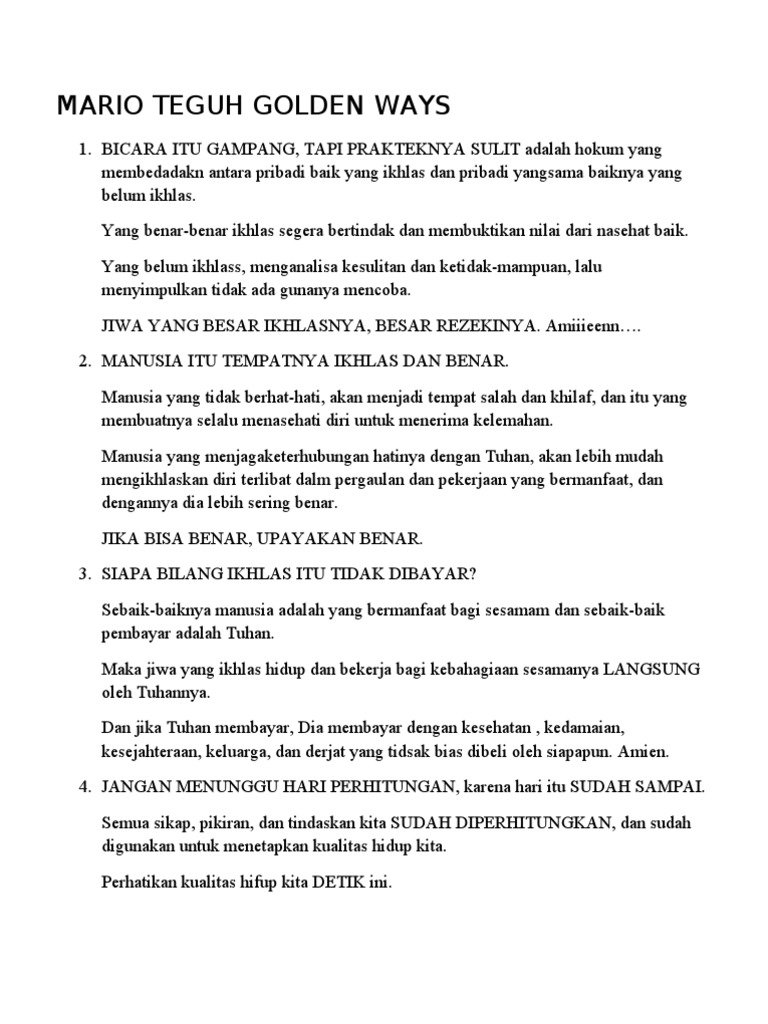 Mario teguh mulai terkenal sejak ditunjuk menjadi seorang motivator di acara mario teguh golden jika anda hanya marah saat putus cinta, dan tak ikhlas memeriksa diri. Menerima kekurangan diri sendiri : Mario teguh merupakan salah satu motivator hebat di indonesia. Read ikhlas from the story mario tegar by elisakrisanti268 with 91 reads.